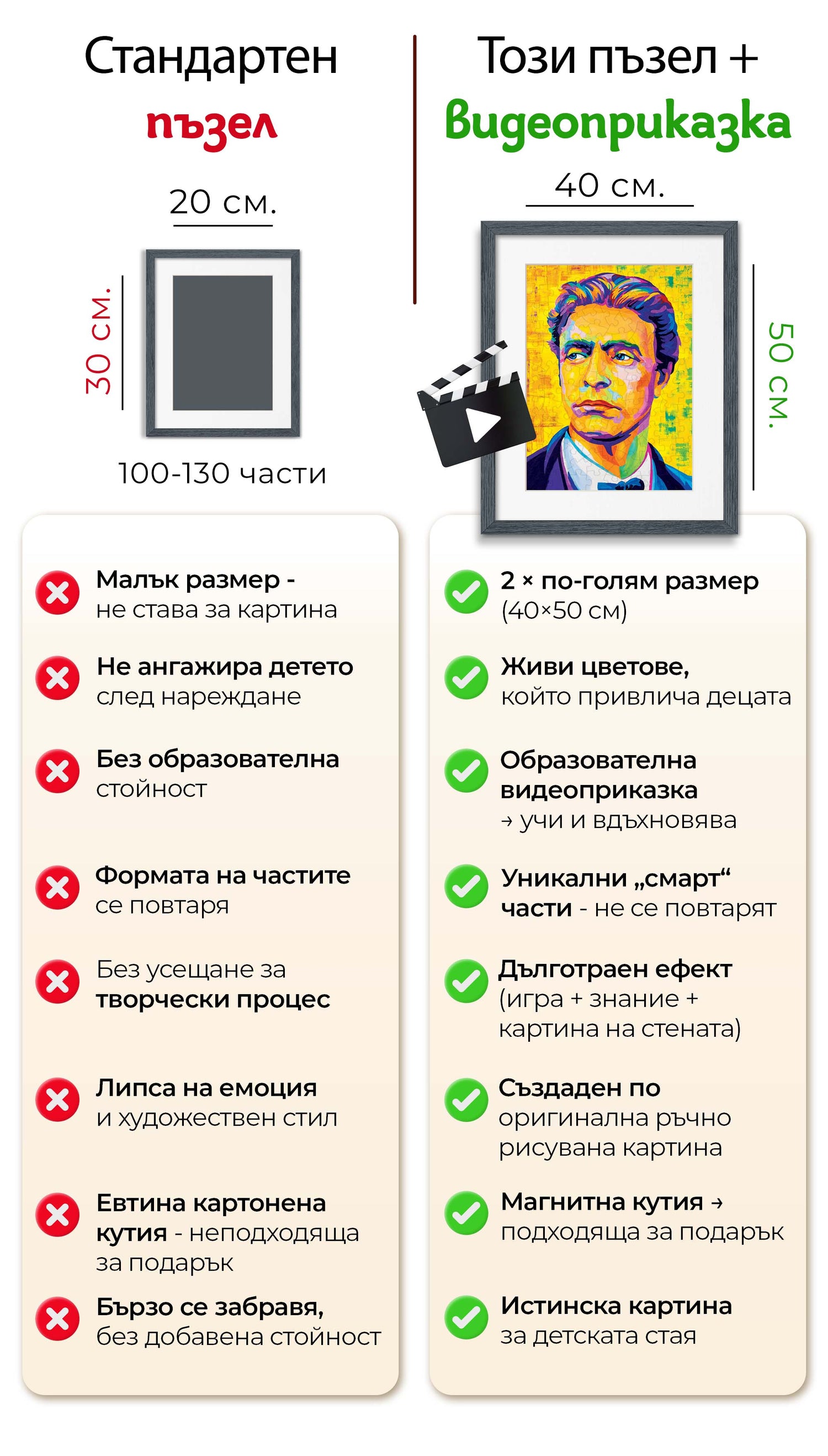 Голям пъзел от 130 части, създаден по модерна авторска картина на Левски, Ботев или Раковски. Ярък, красив, различен от всичко, което сте виждали с размер 40 х 50 см